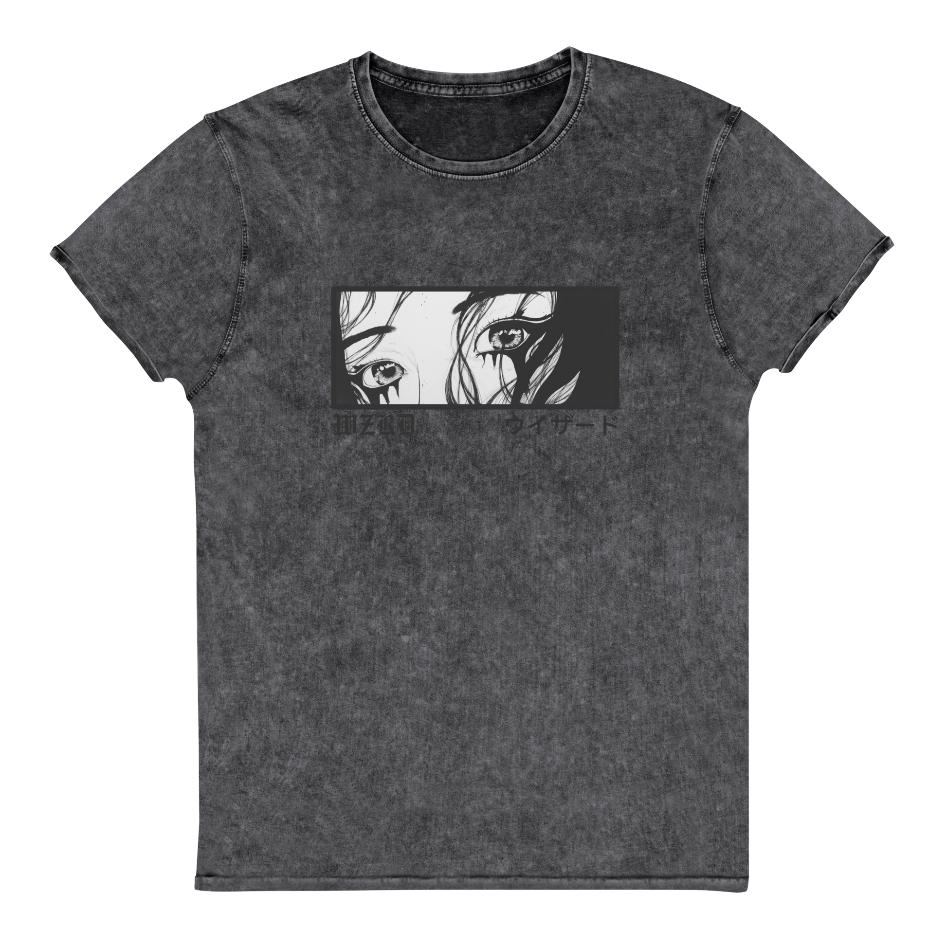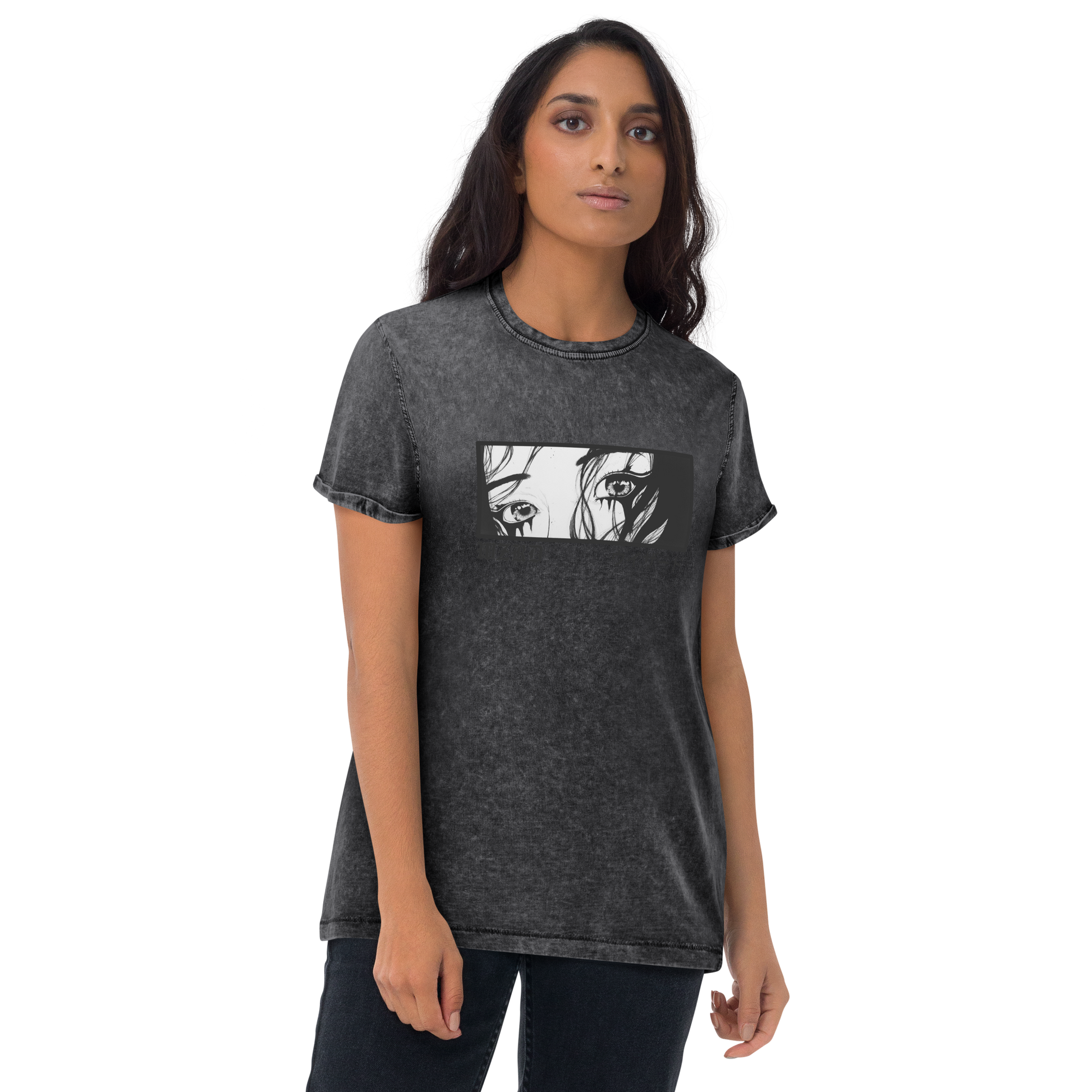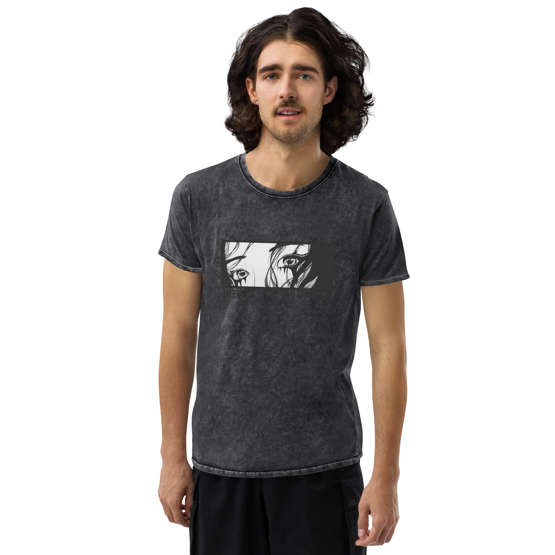 Have you ever seen the look of fear in someone's eyes? It comes for all of us - fear of failure, fear of the unknown, or even just fear of trying. This denim t-shirt is made out of 100% combed cotton and has a classic rounded neckline with ribbed sleeve cuffs to show off those eyes.